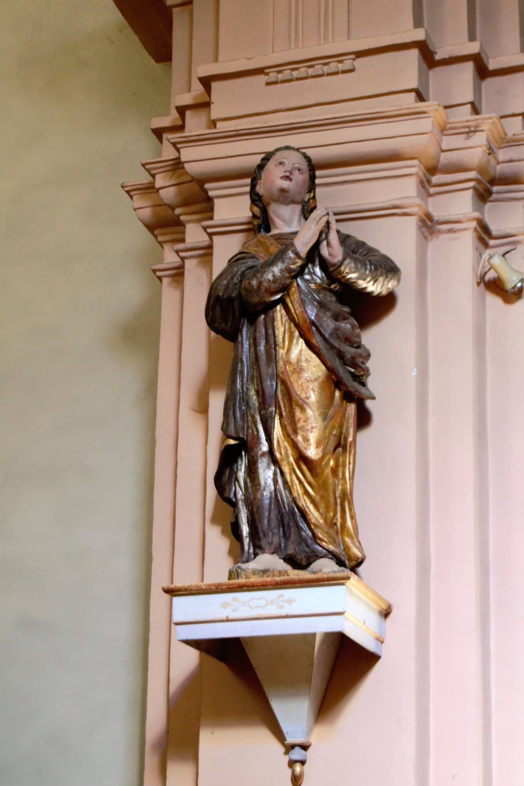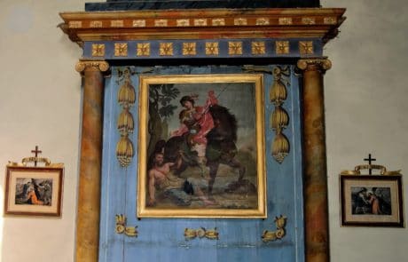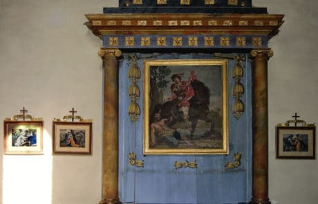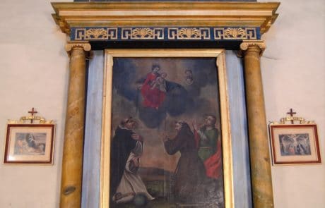 L’autel du Rosaire et son tableau : L’autel actuel date de la fin du XVIIIe siècle, il a été réalisé par Giovan et Carlo Lisandrino. Le tableau est beaucoup plus ancien et provient de l’autel précédent. Il a été peint en 1690 par le peintre Corson dont on ignore tout, c’est un mécène local qui l’a financé : Fillion Martin Didier. Il a été restauré au XIXe siècle par le peintre Zamboni. Sur la gauche du tableau : St Dominique avec le chien portant un bâton enflammé qui le symbolise et la sphère représentant le monde ; à droite, St François d’Assise avec probablement le donateur agenouillé derrière lui ; au-dessus d’eux, la Vierge et l’Enfant Jésus.