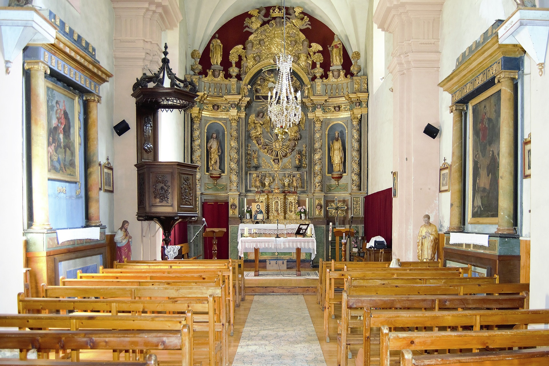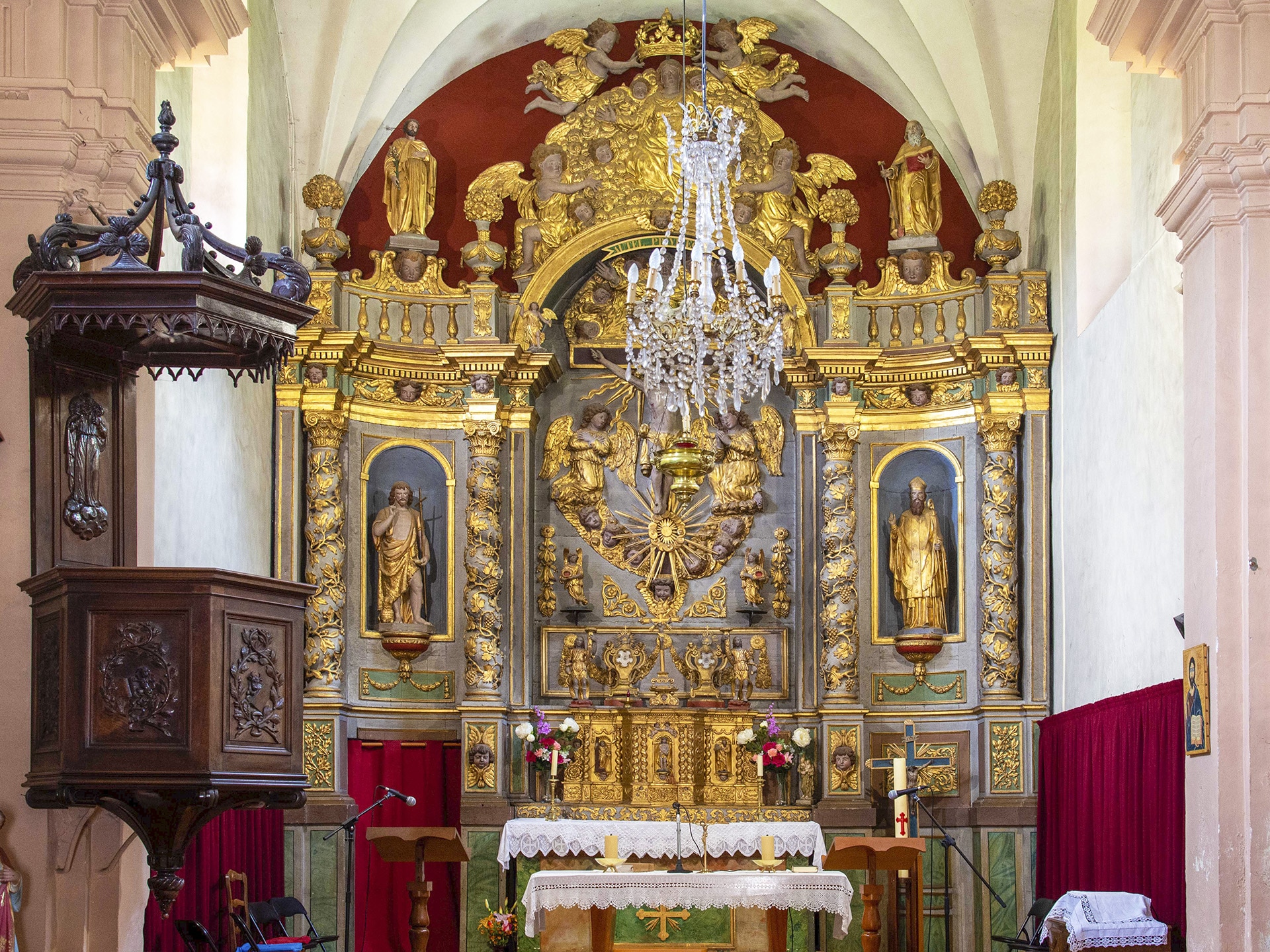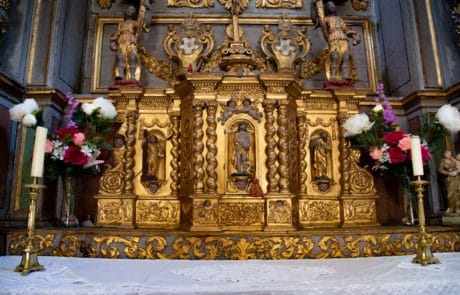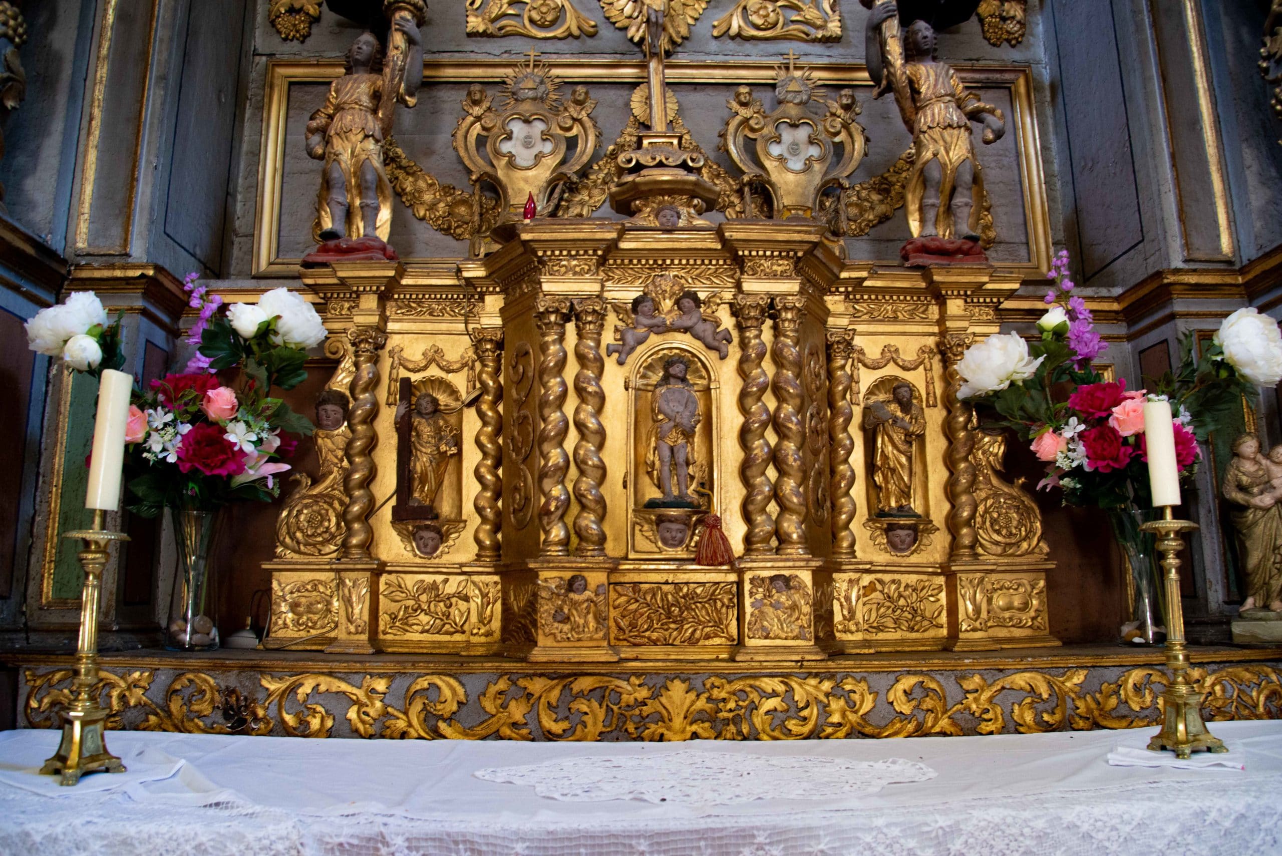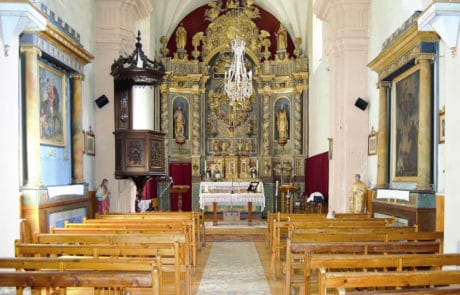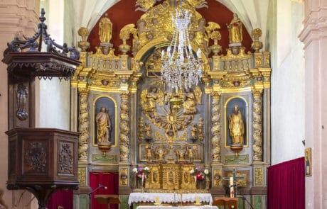 Le maître-autel et son retable : Bien que remanié au XIXe siècle , le maître-autel garde ses caractéristiques baroques : colonnes torses, usage de la feuille d’or, angelots… Il a été réalisé par les sculpteurs Claude Marin et Jacques Clairant (prix-fait du 24 août 1698). Ce retable a coûté le double du prix de la construction de l’église. Il faut admirer en détail son tabernacle pour y découvrir, une belle mais discrète représentation de l’Annonciation.