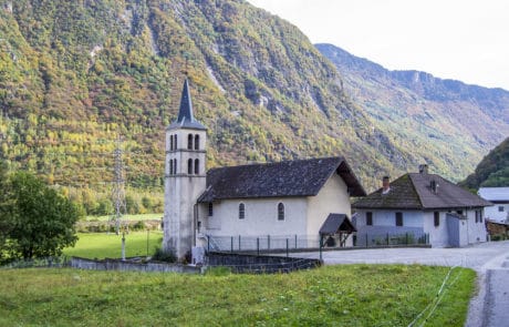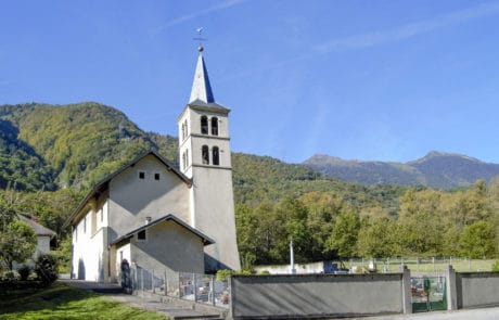 Vue générale de l’église : Dédié à St Martin de Tours, l’église est de dimension modeste, à nef unique. Le prix-fait de sa construction est daté du 19 mai 1687, elle remplace l’église précédente de style roman qui était sur le même site. Elle a été consacrée le 22 août 1699 par Mgr François Amédée d’Arvillars évêque d’Aoste, délégué par l’archevêque de Tarentaise.