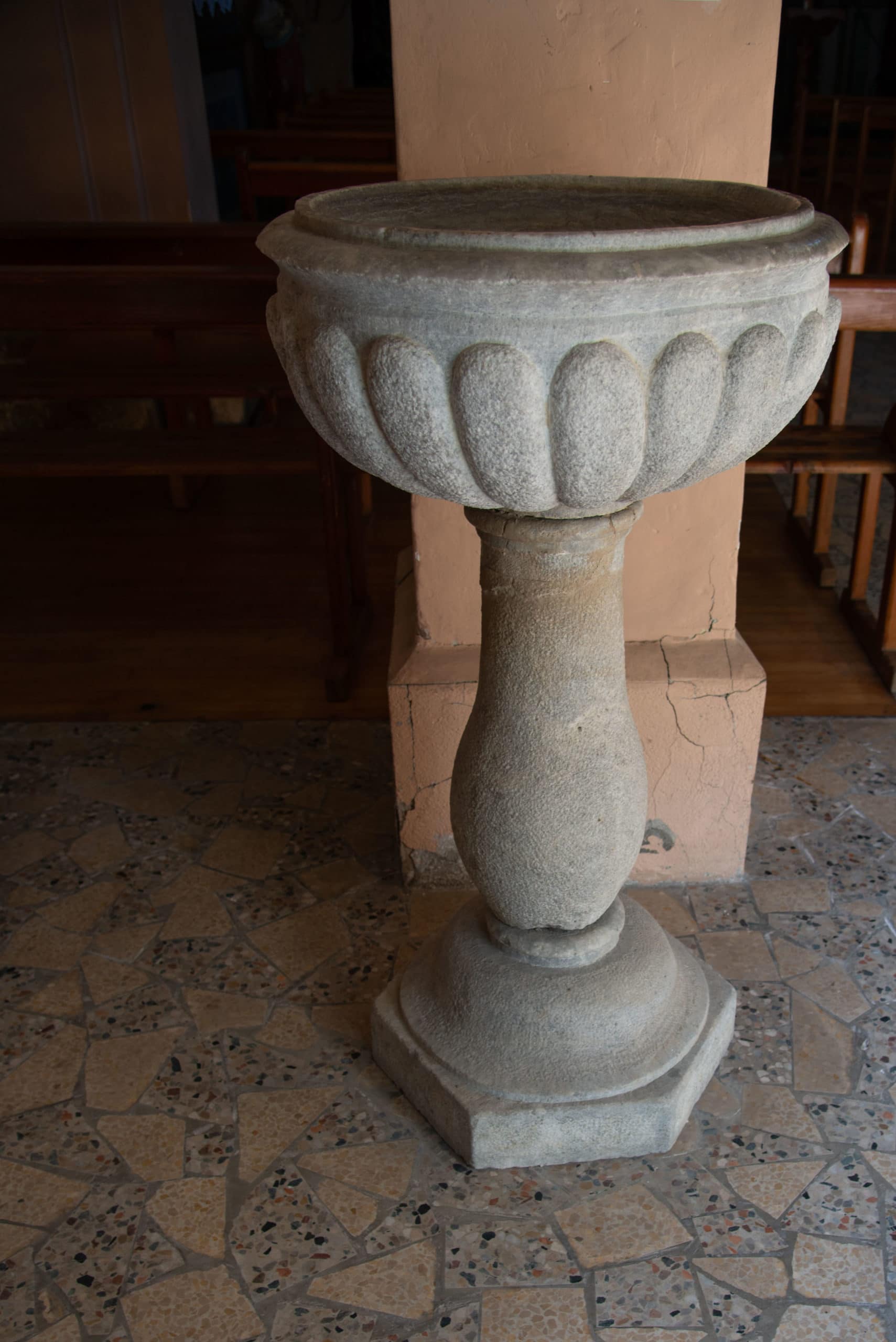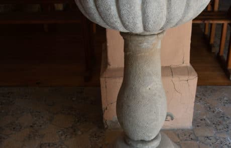 La chaire : Celle que nous voyons aujourd’hui a été acquise en 1843, probablement dans un atelier spécialisé où la production était semi-industrielle. Sur la cuve, on trouve les emblèmes des quatre évangélistes, le Christ Bon Pasteur sur le dosseret et la colombe du St Esprit sous l’abat-voix.